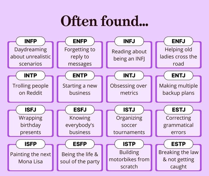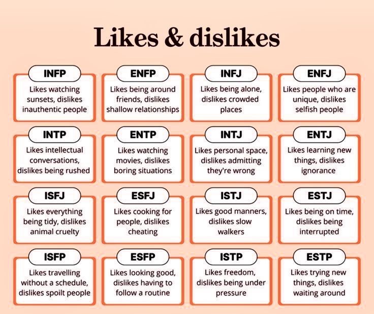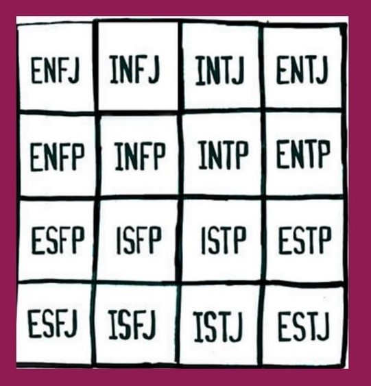 The 16 types of the MBTI personality test were developed based on these four dichotomies; the names of each type are made up of four abbreviations that stand for the classification criteria.